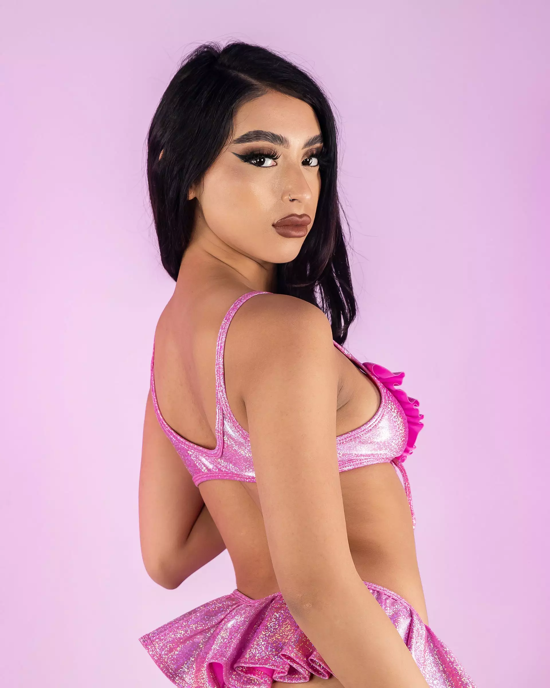 - Bubblegum Pink Metallic Ruffle Wrap Top