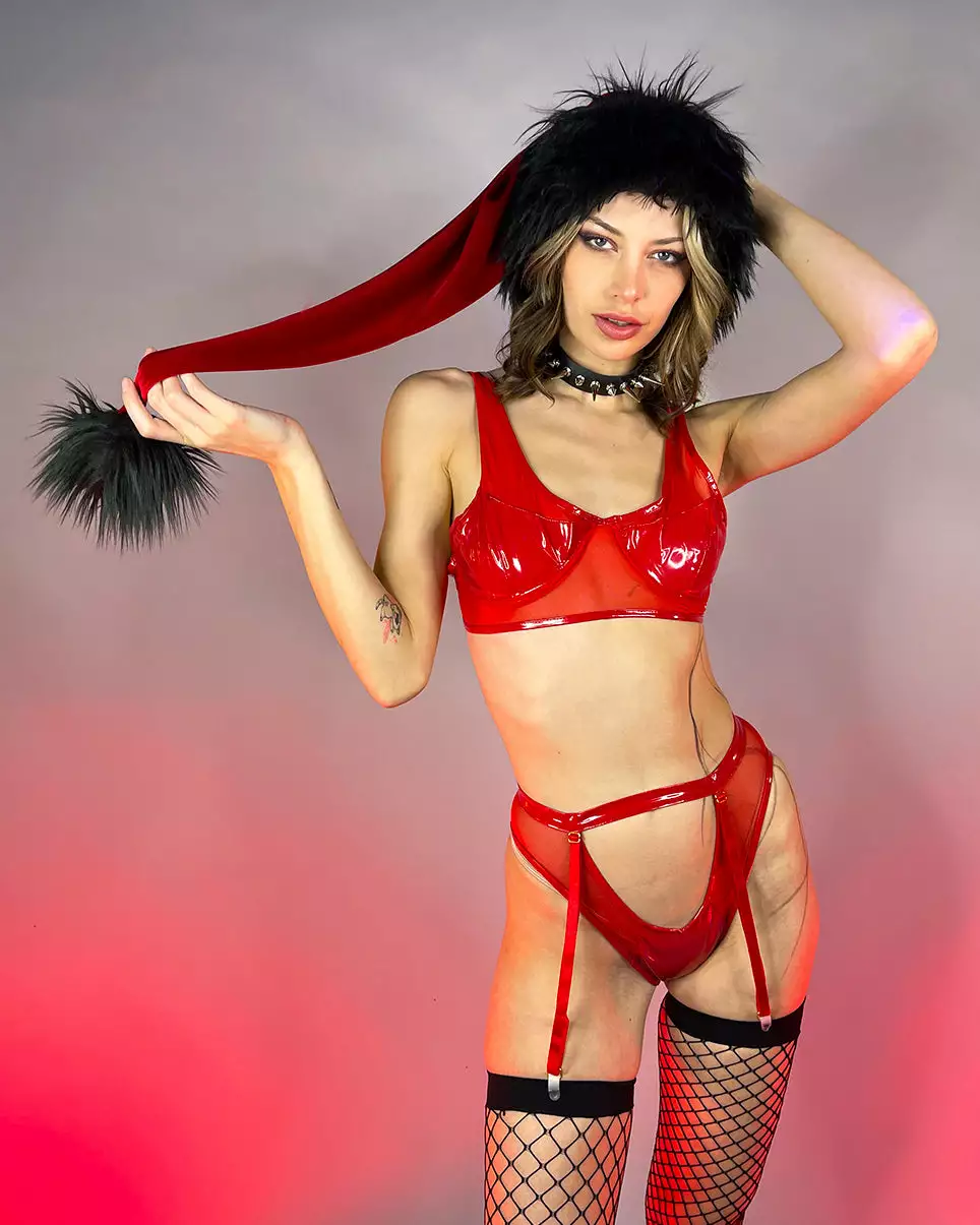 2pc. lingerie set features vinyl and mesh contrast underwire bra with tank silhouette paired with matching peekaboo cutout panty including attached garter straps.