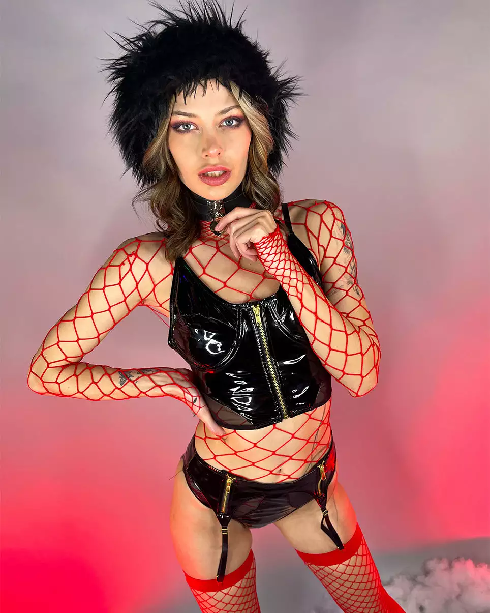 3 pc. lingerie set features vinyl and mesh contrast zipfront bustier with underwire cups paired with matching garter belt and panty.