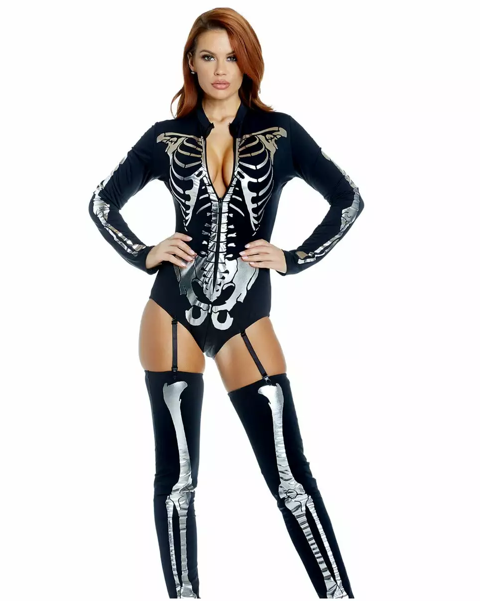 Show people what your sexy insides look like this Halloween with our 2pc Pick A Bone Sexy Skeleton Costume. The zipfront bodysuit with metallic bone screen print comes with garters and is paired with thigh-high leg accessories.