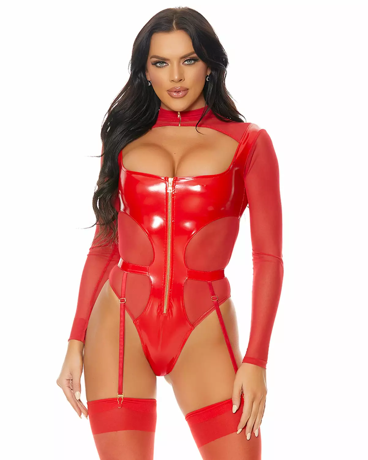 One piece teddy features vinyl and mesh contrast mockneck long sleeve body with zipfront detail including attached garter straps.