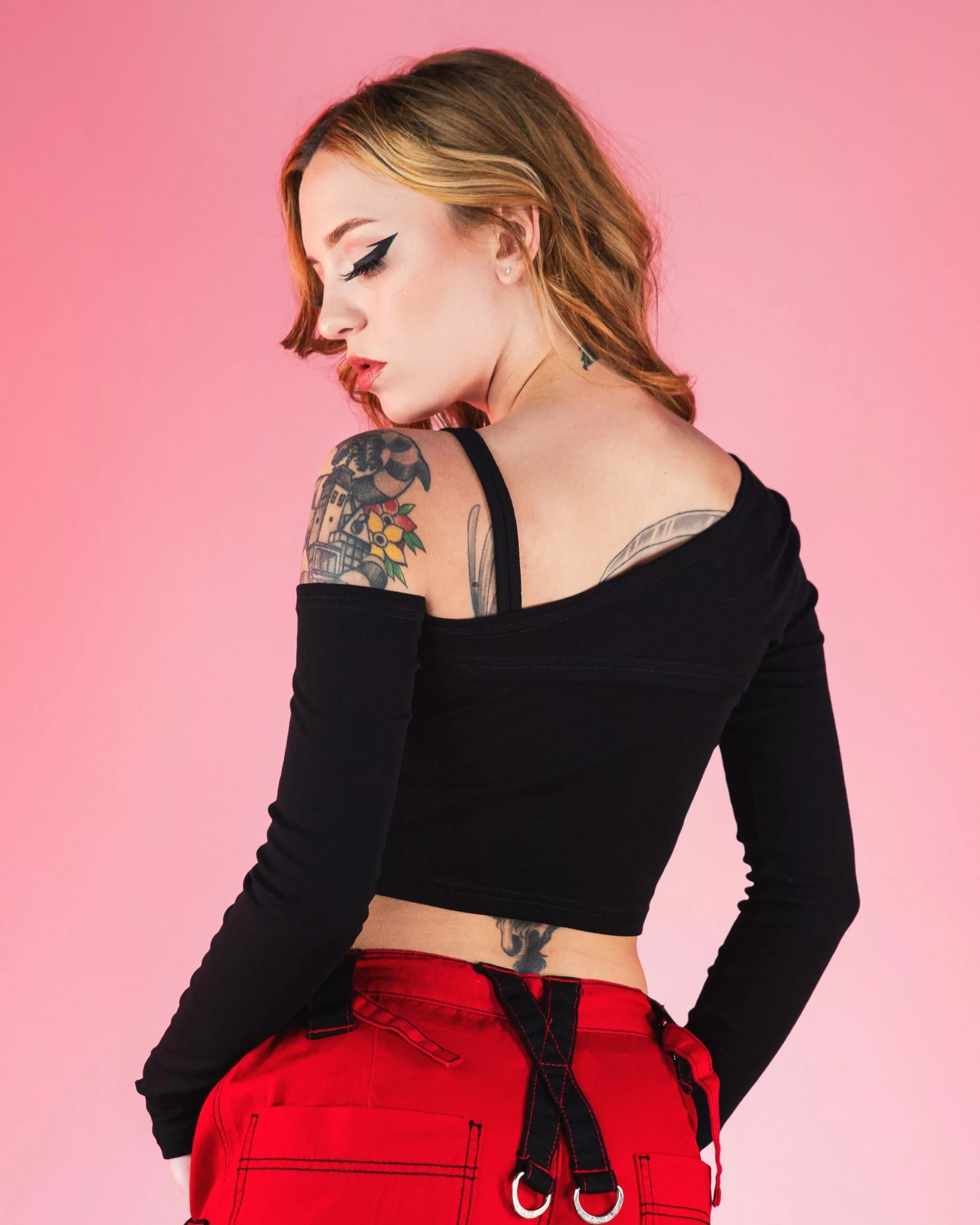 Features off-shoulder cut out detail and asymmetrical neckline. A versatile top that can be styled for any kind of look!