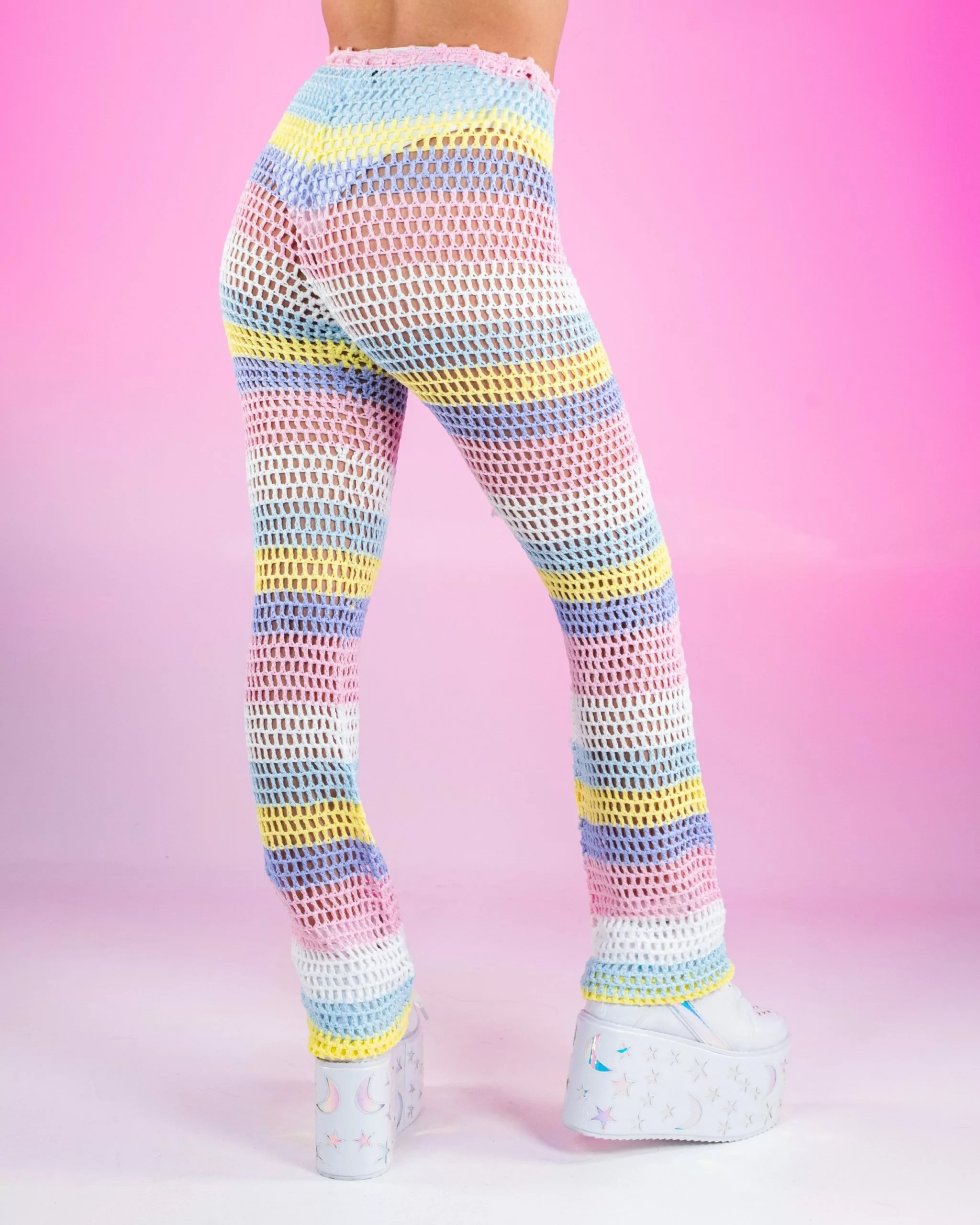 - Includes crochet tie bikini top & striped crochet net pants with side lace-up detail.
