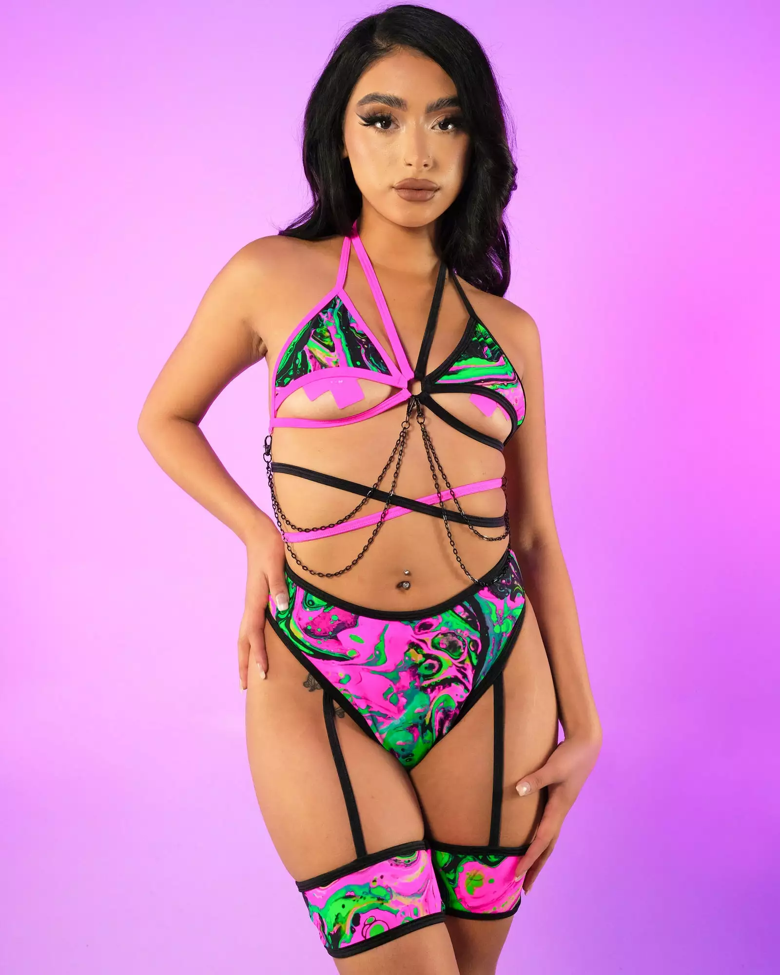 Rolita Couture Acid Waves Renegade Harness Bottoms – Raise the roof in these neon pink and green harness bottoms matched with a touch of black accent to compliment your mood for the night.