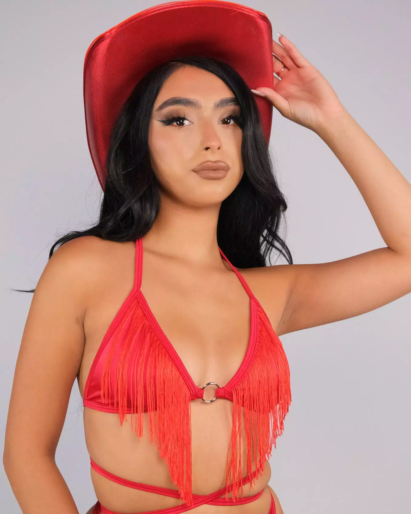 Stay lookin’ fierce while ur ridin’ into town in Rolita Couture’s fringe bikini wrap top! With intricate details and fashionable style, ur guaranteed to turn heads in this seductive outfit! Pair with Rolita Couture’s Sunrise Fringe Bottoms for a complete look!