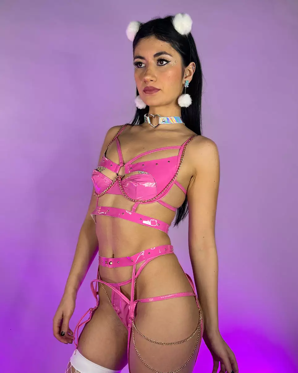 Roma 3pc Chain & Vinyl Pink Lingerie Set