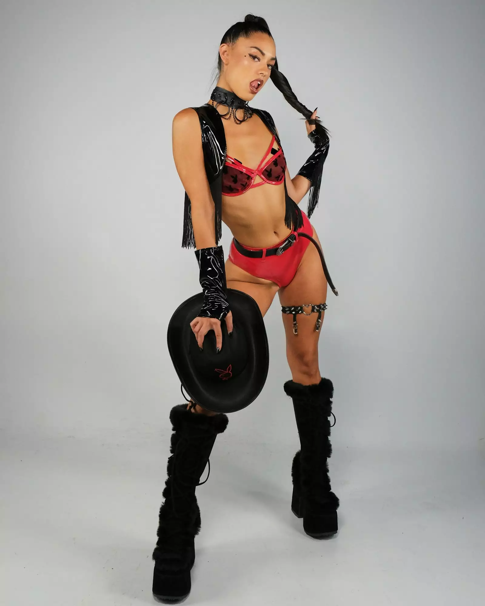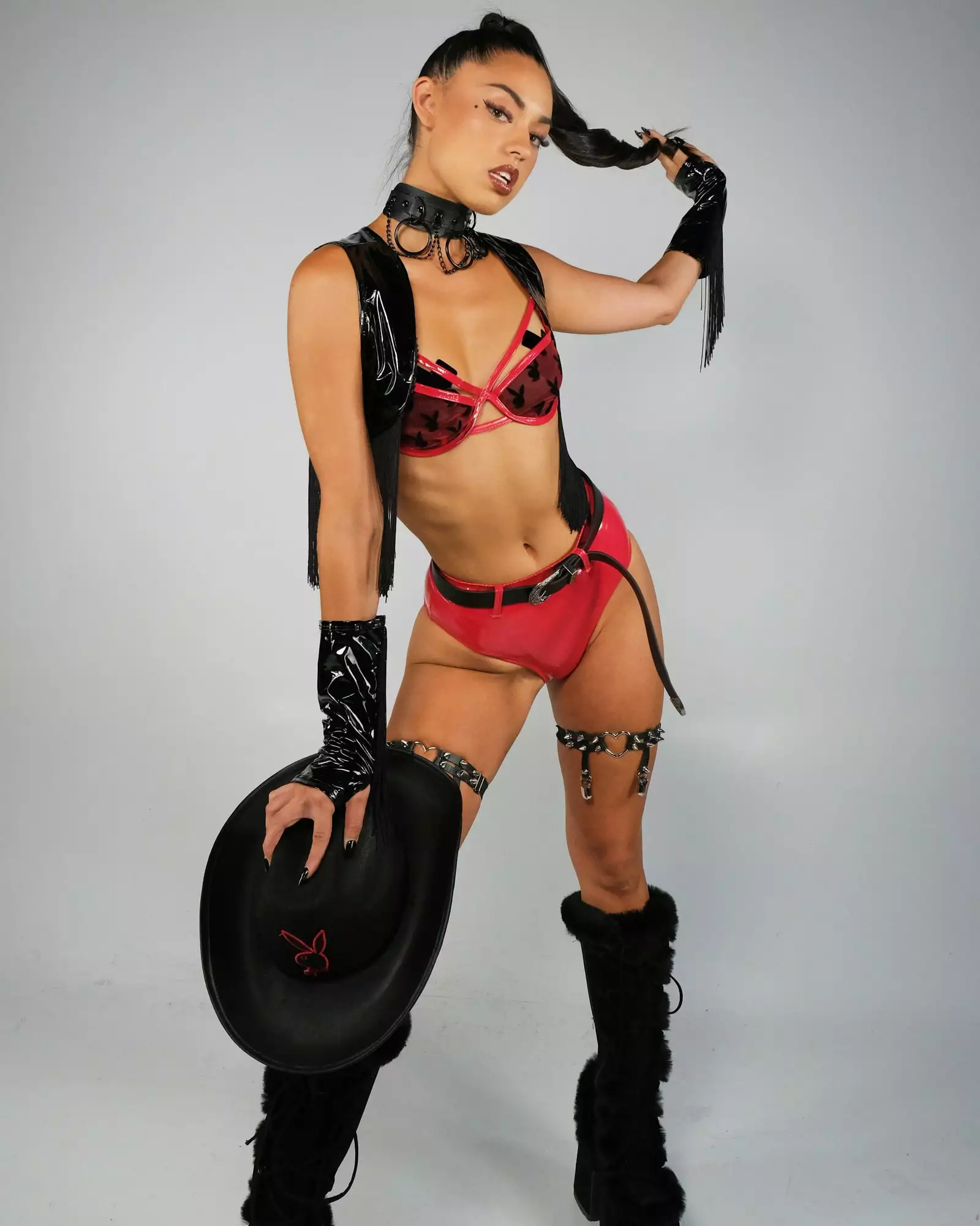 Includes Vinyl Vest with Fringe, Bra with Flocking Bunny, High-Waisted Vinyl Shorts, Belt, Vinyl Gloves with Fringe, & Hat with Bunny Patch.