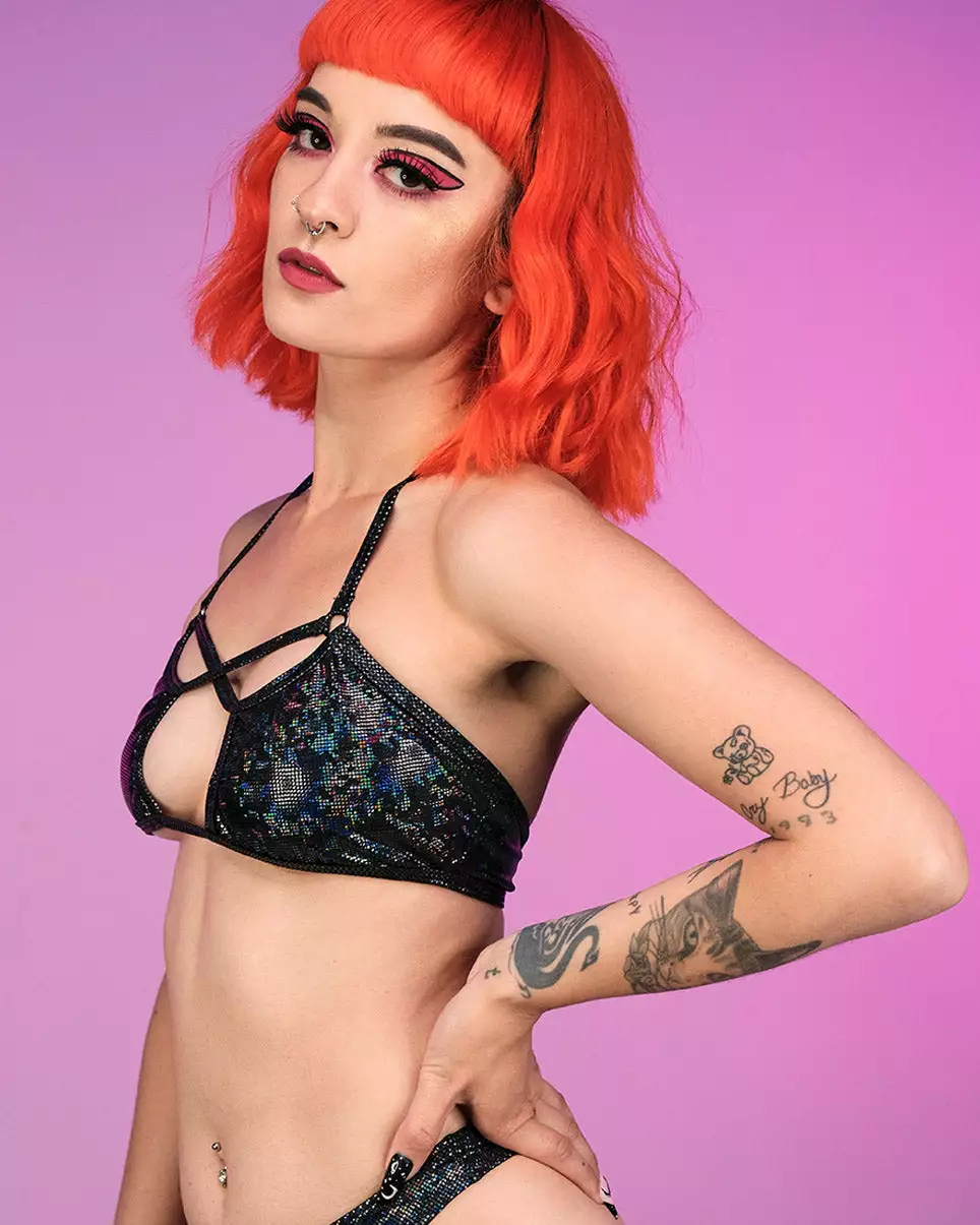 Black Holographic Shimmer Bikini Top with Criss-Cross Detail