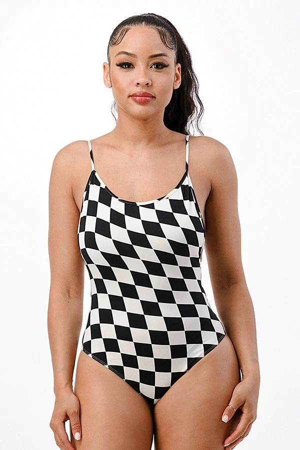 Get trippy in this wavy checker bodysuit! Features an open low back and spaghetti straps.